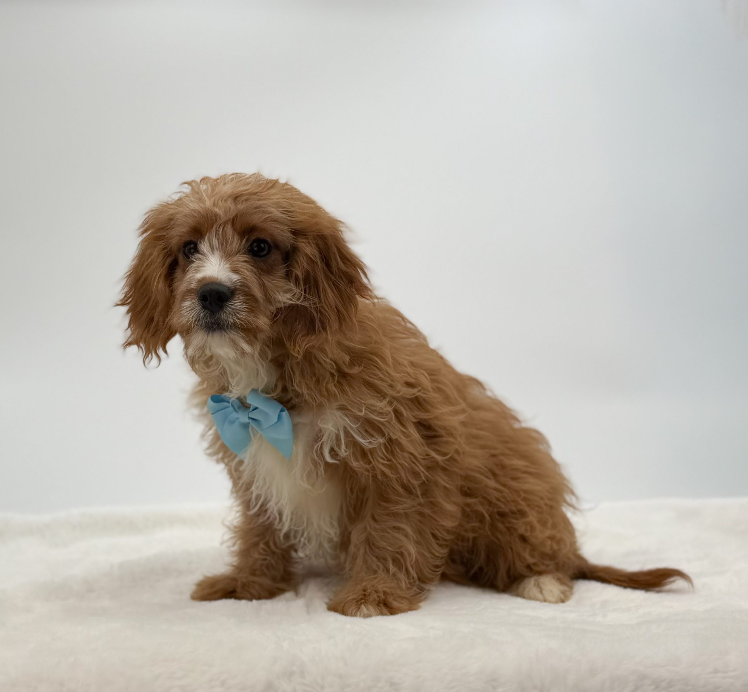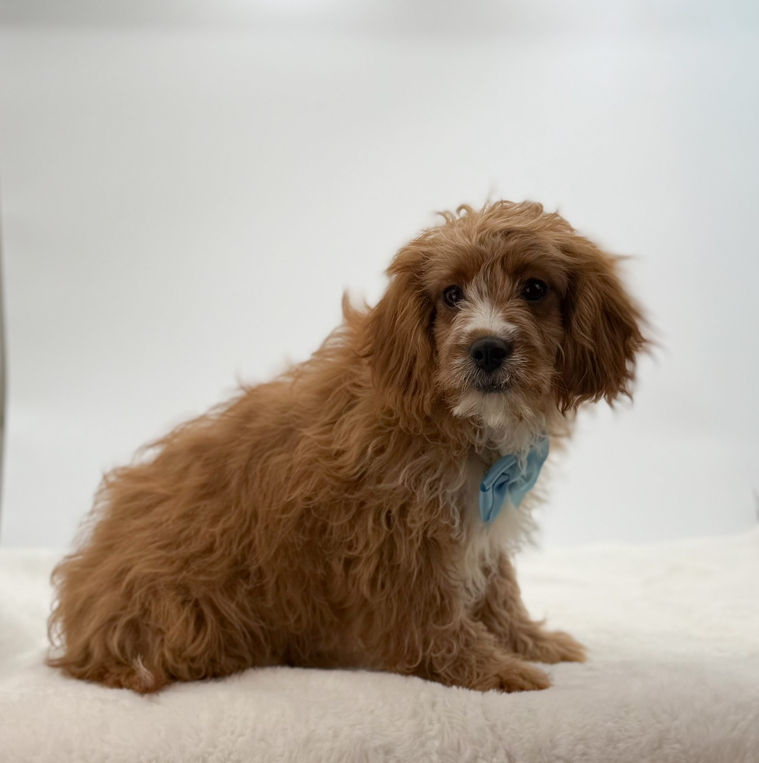 Meet Grady, our adorable little F1B cavapoo puppy looking for his forever home! With his soft, curly fur and big, sparkling eyes, Grady captures everyone’s heart the moment they see him. He is more than just a pretty face; he is incredibly playful and full of energy. He will love to be by your side for all your adventures both great and small. He enjoys spending time outdoors, exploring new places, and making new friends. If you’re looking for a charming, lovable puppy who will fill your days with laughter and joy, Grady is the one for you! Don’t miss the chance to welcome this adorable little guy into your home.