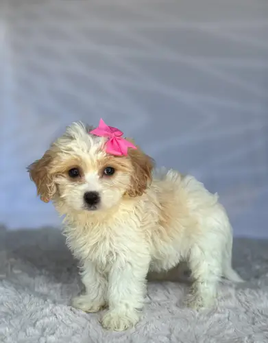 Meet Tina! This little girl is sure to steal hearts wherever she goes! With her fluffy coat of white and light brown fur, Tina is as cute as a button. Her big round eyes make your heart melt every time you look at her. Her fun and playful spirit is contagious, and she’ll turn any dull moment into a fun adventure! Don’t miss the chance to welcome this darling puppy into your heart and home!