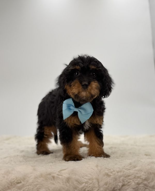 Introducing **Zephyr**, a charming **black and tan F1b Cavapoo puppy** with the perfect balance of playful energy and gentle affection. His glossy coat, expressive eyes, and sweet personality make him a true standout among Cavapoos.